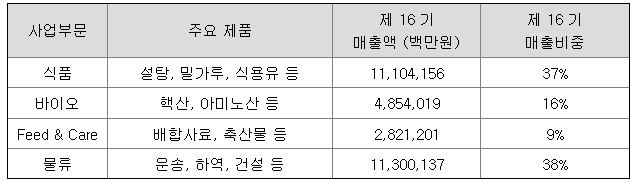 주요 사업의 내용은 설탕, 밀가루, 식용유, 조미료, 장류, 육가공식품, 신선식품, 쌀가공식품, 냉동식품, HMR, 건강식품 등을 생산ㆍ판매하는 식품사업, 아미노산 등의 생산ㆍ판매 사업을 영위하는 바이오사업, 사료ㆍ축산 사업을 영위하는 Feed & Care사업, 국내외물류사업ㆍ컨테이너사업ㆍ택배사업ㆍ건설사업 등을 주된 사업부문으로 하는 물류사업 등 입니다.